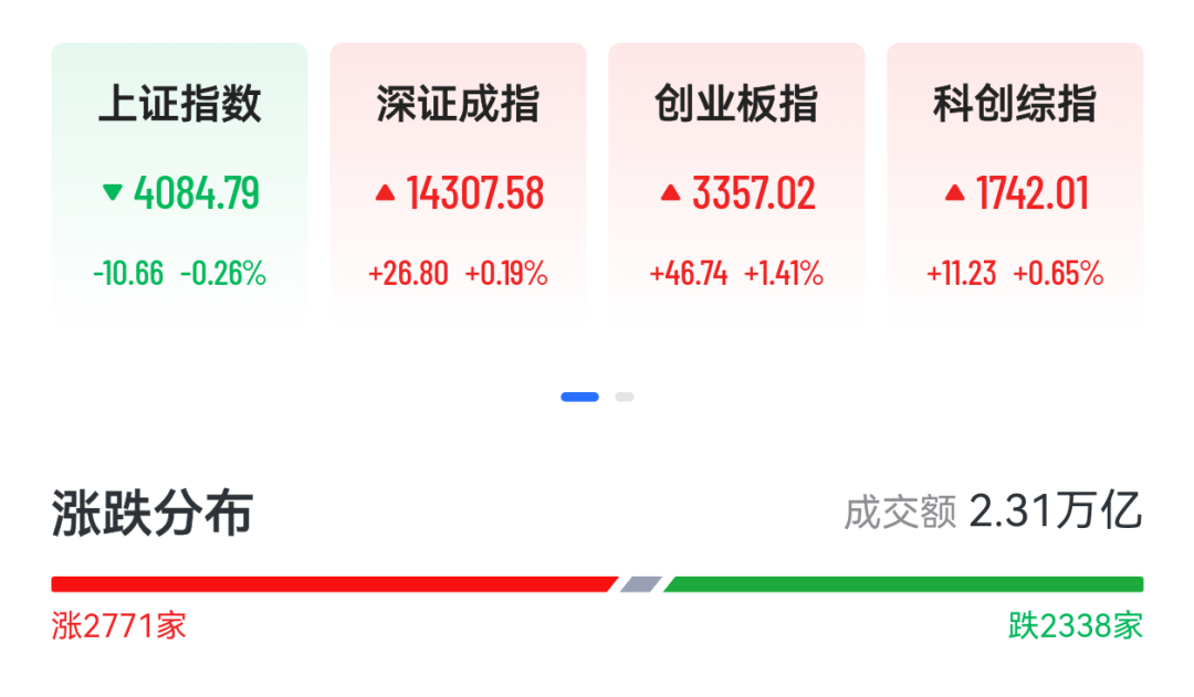 A股市场探底回升,截至收盘,沪指跌0.26%,深成指涨0.19%,创业板指涨1.41%,科创综指涨0.65%。沪深两市成交额2.31万亿元,较上一个交易日缩量750亿元。盘面上,市场热点快速轮动,全市场超2700只个股上涨。
