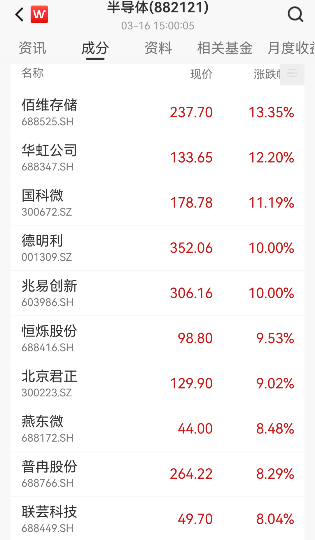 3月16日,半导体、存储芯片板块持续走高,总市值超2000亿元的华虹公司A股一度大涨超16%,截至收盘涨超12%,华虹半导体一度大涨超11%。