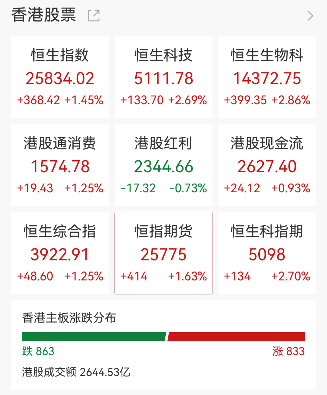 港股强势反攻,截至收盘,香港恒生指数收涨1.45%,恒生科技指数收涨2.69%。